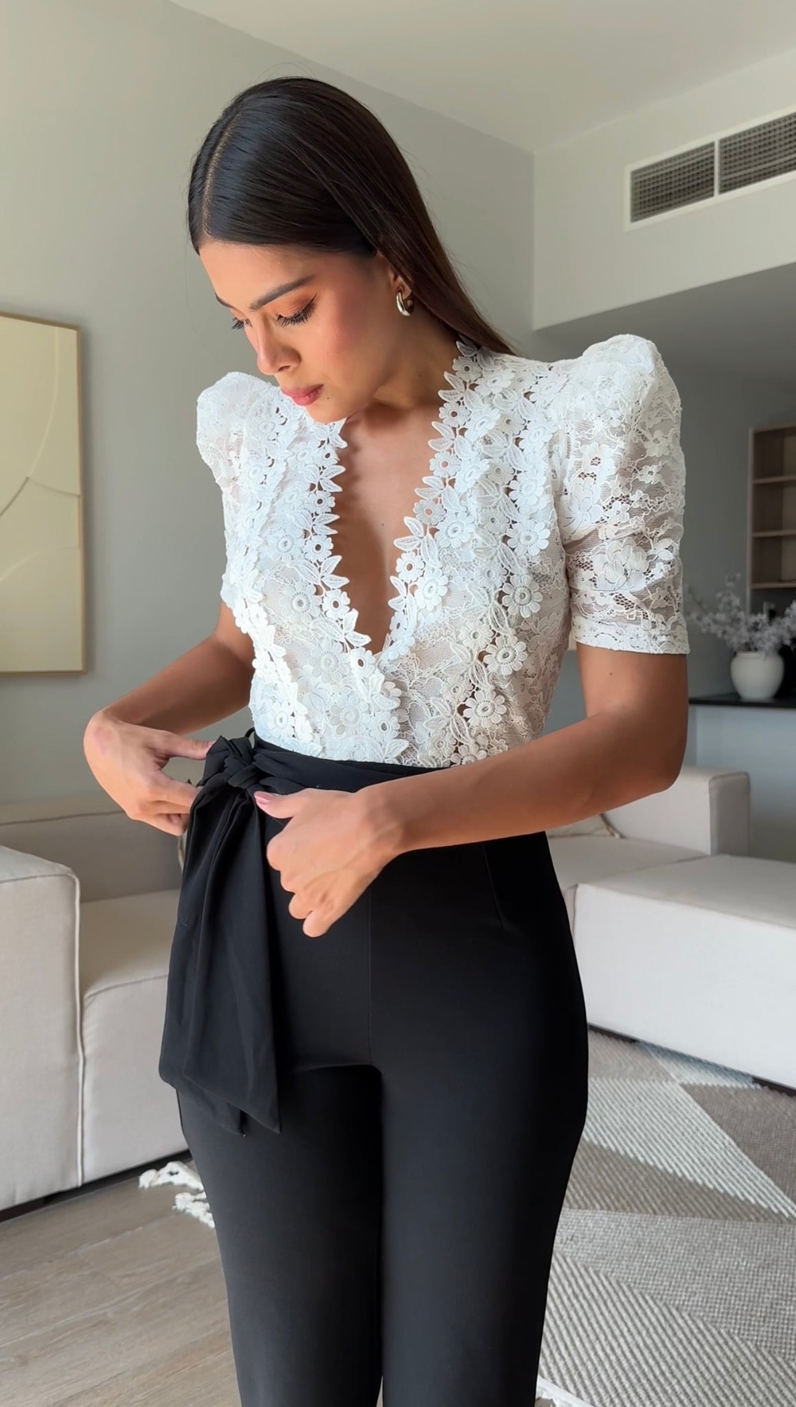 Cinturón incluido ,diseño de moño a tono con el enterizo, cremallera metálica, costura delantera en el pantalón.